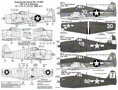 Microscale - SS72802 - 1:72 | Grumman F6F-3/F6F-5 Hellcats (4) No 30/K VF-1 USS Yorktown; No 3/X VF-51 USS San Jacinto both 1944 3 tone schems; No 59 VF-17 USS Hornet; No 92/I VMF-511 USS Block Island. both 1945 overall gloss sea blue More | Aircraft decals (military) | Catalogue | £7.99 | ||