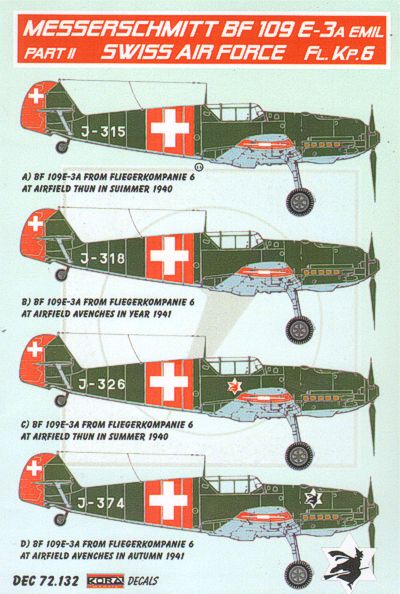 Kora - KORD72132 - 1:72 | Messerschmitt Bf-109E-3A Emil x 4 Part II (Swiss Air Force) More | Aircraft decals (military) | Catalogue | £6.70 | ||
