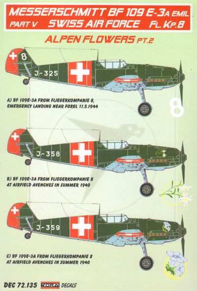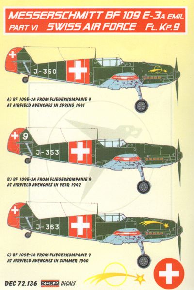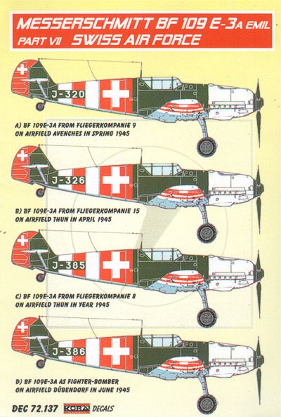 Kora - KORD72135 - 1:72 | Messerschmitt Bf-109E-3A Emil Part V x 3 (Swiss Air Force) More | Aircraft detailing sets (decal and resin) | Catalogue | £6.70 | ||