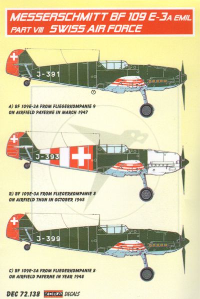 Kora - KORD72138 - 1:72 | Messerschmitt Bf-109E-3A x 3 Emil Part VIII (Swiss Air Force) More | Aircraft detailing sets (decal and resin) | Limited Availability | £7.60 | ||