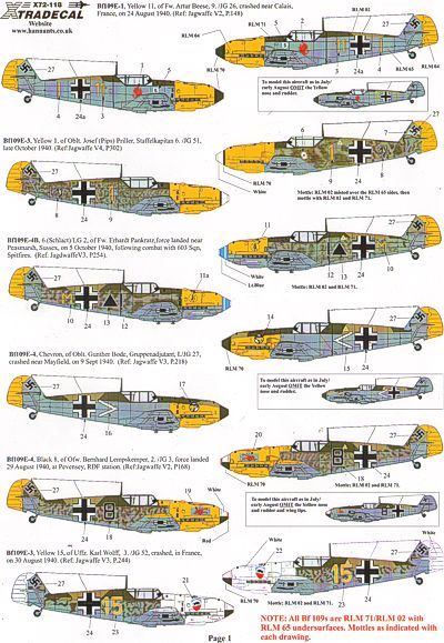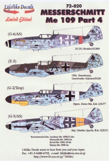 Lifelike - LL72020 - 1:72 | Messerschmitt Bf-109 Py 4 (5) Bf-109E-3 Black A JG 26 Oblt Hassemann; Bf-109G-2 Trop Black << 1/JG 77 Hptm Heinz Bar; Bf-109G-5 Grey << II/JG 11 Maj Gunther Specht; BF-0G-6 White 1 JG 800 More | Aircraft decals (military) | Catalogue | £9.80 | ||