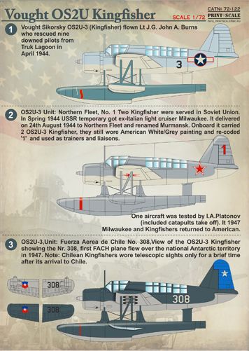 2. OS2U-3 Unit: Northern Fleet, No. 1 Two Kingfisher were served in Soviet Union. In Spring 1944 USSR temporary got ex-Italian light cruiser Milwaukee. It delivered on 24th August 1944 to Northern Fleet and renamed Murmansk. Onboard it carried 2 OS2U-3 Kingfisher, they still wore American White/Grey painting and re-coded '1' and used as trainers and liaisons.