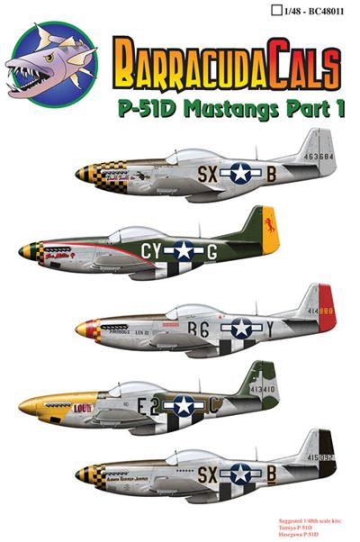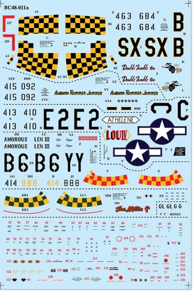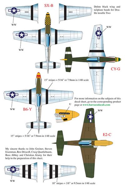 North-American P-51D Mustangs of the 8th Air Force (5) 44-63684 SX-B 352FS 353FG Lt.Col.William B.Bailey 'Double Trouble Two' Black/Yellow check nose RAF Raydon; 44-14985 CY-G 343FS 55FG Maj. Edward Giller 'The Millie G' Yellow/Green check nose band RAF Wormingford; 44-14888 B6-Y 363FS 357FG Chuck Jaeger 'Amourous Len III' 1944 Red/Yellow check nose band RAF Yoxford; 44-13410 E2-C 375FS Lt.Col Thomas Christian KIA 12-8-44 'Lou IV/Athelene' Yellow Nose RAF Bottisham; 44-15092 SX-B 'Alabama Rammer Jammer' Black/yellow nose band RAF Raydon.
