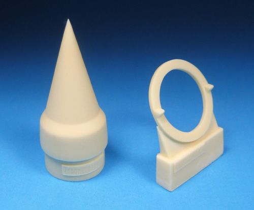 Mikoyan MiG-21 Radome Upgrade Set. Designed for the superb Eduard MiG-21 series. The kit radome is accurate and well molded. The problem is that you have to paint and install it before you assemble the fuselage halves. Our separate radome and bulkhead allow you to assemble the fuselage without the radome, which is then installed when the model is almost finished. This will allow you to fill and sand the intake seams, and paint the intake and radome separately. You can also use the intake as a receptacle for a handle that will allow you to hold the model firmly while painting it. It also removes the possibility of damaging the radome point during assembly and painting. Quick and easy... problems solved! (designed to be used with Eduard kits)[MiG-21PF MiG-21PFM MiG-21MF MiG-21S MiG-21MFN MiG-21R MiG-21SMT MiG-21BIS]