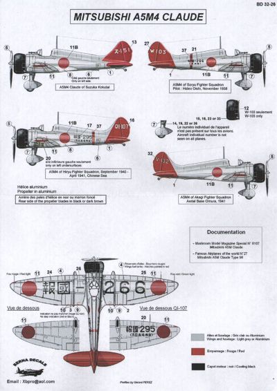 Mitsubishi A5M4 'Claude' : Oishi Soryu FS (W-103) 1938, Itaya Hiryu FS (Q1-107) 1940, Akagi FS (V-132) 1941, Suzuka Kokutai (Z-151)