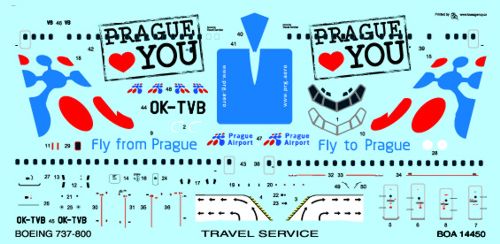Boeing 737-800 TRAVEL SERVICE Fly from Prague OK-TVB (designed to be used with Revell kits) Manufacturer: Boa Decals Code Number: BOA14450 Scale: 1:144 Item type: Aircraft decals (civil) Price: