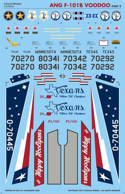 Air National Guard McDonnell F-101B Voodoo Part 2: This follow-on to our first F-101B sheet features F-101B markings from North Dakota, Minnesota and Texas Air National Guard units. Some of the most striking markings ever worn by the Voodoo. The options on this decal sheet are: