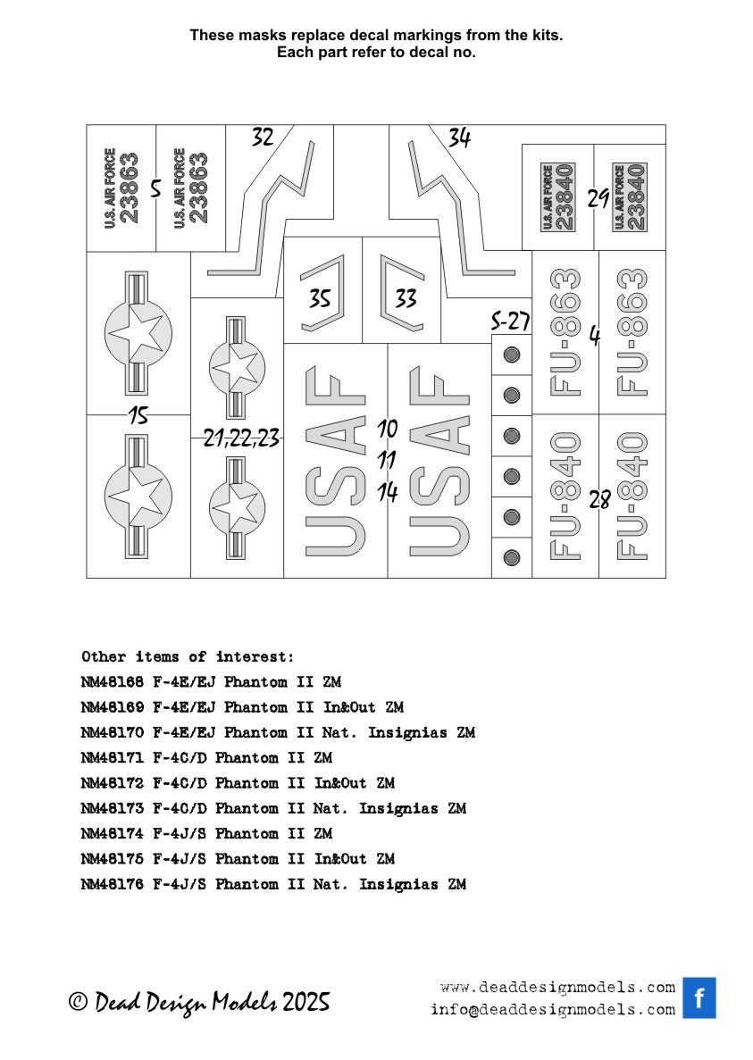 North-American F-86D Sabre Dog National Insignia (designed to be used with Monogram kits) (This will not be kept in stock but can be added to our next order if you place it on Backorder. (on Backorder please not on a Wish list) Manufacturer: Dead Design Models Code Number: DDMNM48316 Scale: 1:48 Item type: Aircraft paint masks (self adhesive) Price: