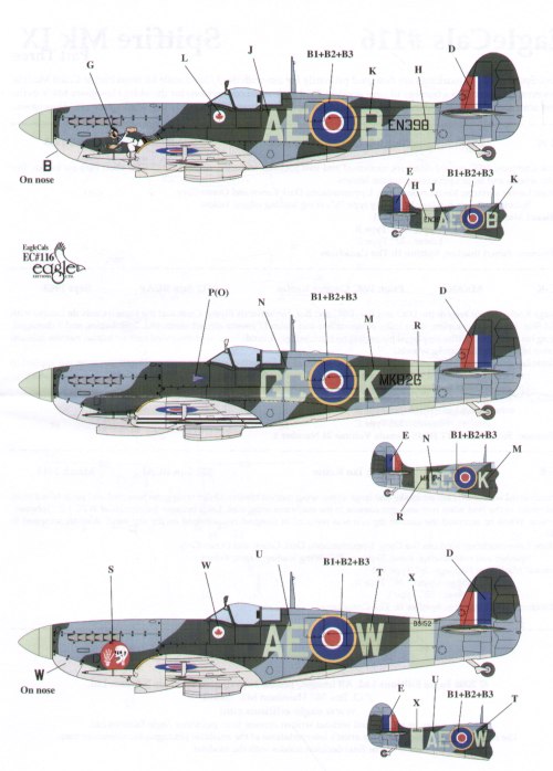 Supermarine Spitfire Mk.IX (3) BS152 AE-W 402 Sqn RCAF S/L L.M.Cameron; MK826 GC-K 412 Sqn RCAF W/C George Keefer; EN398 AE-B 402 Sqn RCAF Ian Keltie. All 1943 [Mk.IXc Mk.IXe]
