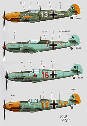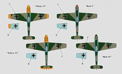 Messerschmitt Bf-109E-1 Part 2 (4) White 13 4/JG 77 Hptm Helmut Henz 1941; Red 1 2/JG 27 Oblt Gert Framm 1940; Red 16 2/JG 26 Oblt Fritz Losikeit 1940; Yellow 12 9/JG 52 1941. All in variations of RLM 02/71/65