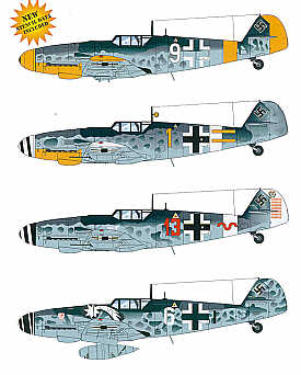 Messerschmitt Bf-109G-6 (4) White 9, Gunther Josten, 1/JG 51, Bobruysk, Russia, April 1944; Yellow 1, Staffelkapitan Oblt. Dietrich Boesler, 12/JG 27, Tanagra, GreeceSummer 1943; Red 13, W.Nr 27169, Pilot Fw. Heinrich Bartels, II/JG 27, Kalamai, Greece, November 1943; White 6, W.Nr26025, 7/JG 3, Bad Worishofen, Germany, October 1943