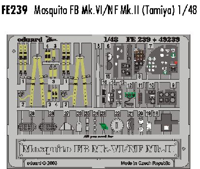de Havilland Mosquito Mk.VI/NF.II PRE-PAINTED IN COLOUR! (designed to be used with Tamiya kits) Includes about 20 of the more important and prominent parts for detailing the aircraft. Most sets are also available as part of a double set for the modeller who wants even more detail. Please see the picture for the double set part number.