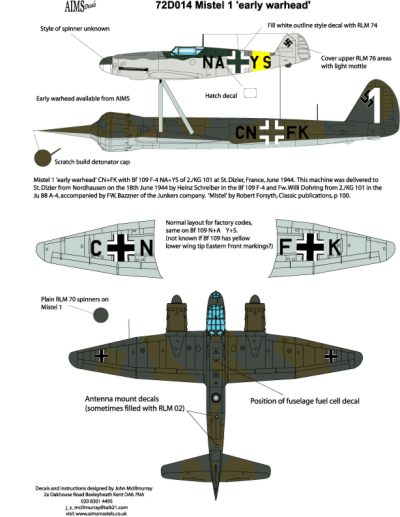 Aims - AIMS72D014 - 1:72 | Mistel 1 with Early Warhead (1) Messerschmitt Bf-109F-4 NA+YS 2/KG101 above Junkers Ju-88A-4 CN+FK More | Aircraft decals (military) | Catalogue | £4.50 | ||