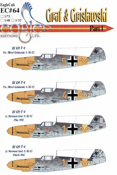 Eagle Cal - EAG72064 - 1:72 | Messerschmitt Bf-109F-4 Graf and Grislawski 9/JG 52 Pt 1 (4) Graf Yellow 1+~ 2 versions; Grislawski Yellow 4+~ replaced with Yellow 5+~ May 1942. All RLM 74/75/76 with yellow nose and fuselage band. More | Aircraft decals (military) | Catalogue | £10.99 | ||