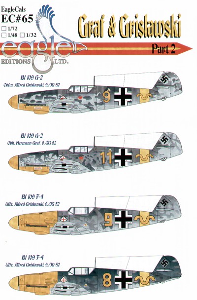 Eagle Cal - EAG72065 - 1:72 | Messerschmitt Bf-109F-4/Bf-109G-2 Graf and Grislawski 9/JG 52 Part 2 (4) Bf-109G-2 Graf Yellow 11+~; Grislawski Yellow 9+~; F-4 Yellow 9+~; Variations of RLM 74/75/76; Yellow 8+~.RLM 70/74/75/76. All yellow nose and fuselage band More | Aircraft decals (military) | Catalogue | £10.99 | ||