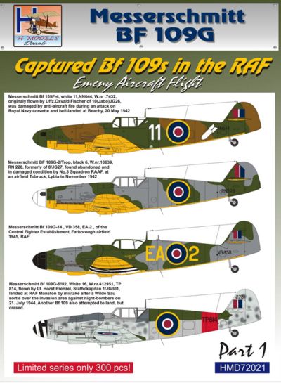 H-Model Decals - HMD72021 - 1:72 | Captured Messerschmitt Bf-109s in RAF, Pt.1 [Bf-109F-4 Bf-109G-2/Tropical Bf-109G-14 Bf-109G-6/U2 More | Aircraft decals (military) | Catalogue | £6.30 | ||