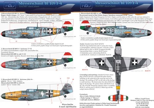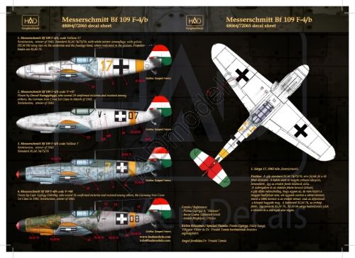 HAD Models - HUN72087 - 1:72 | Messerschmitt Bf-109F-4 M (Hungarian V0+39 Alad'r Heppes, V-+12, German white 4) More | Aircraft decals (military) | Limited Availability | £8.99 | ||