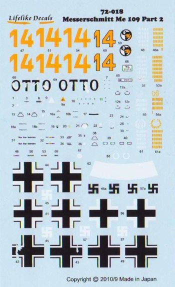 Lifelike - LL72018 - 1:72 | Messerschmitt Bf-109F-4 Tropical. H.J.Marseille special. Includes decals for his Kubelwagen 'Otto' and 4 'Yellow 14' aircraft. W Nr 8673 with G Type propeller; W Nr 10137; W Nr 10059; W Nr 8693 More | Aircraft decals (military) | Catalogue | £9.80 | ||