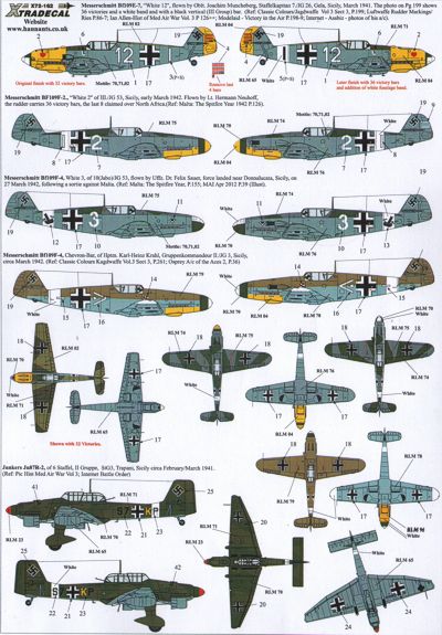 Xtradecal - X72162 - 1:72 | The Battle for Malta Axis (9) Messerschmitt Bf-109E-7 White 12 7/JG 26 Oblt Joachim Muncheberg; Bf-109F-2 White 2 III/JG 53 Lt Hermann Neuhoff; Bf-109F-4 White 3 10(Jabo)/JG 53 Uffz Felix Sauer; White >> JG 3 Hptm Karl-Heinz Krahl Gruppencommander; Junkers Ju-87R 'Stuka' - S7+KP 6 Staffel, II Gruppe,StG3; Messerschmitt Bf-110D 3U+KT 9/ZG 26; Junkers Ju-88A-4 LJ+FN 5/LG 1; Macchi C.202 CL III 152 Gruppo Caccia Terreste; Macchi C.200 Saetta 81-14 83 Squadrigilia 6 Gruppo. More | Aircraft decals (military) | Catalogue | £7.99 | ||