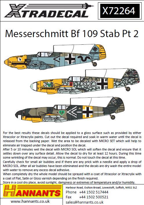 Xtradecal - X72264 - 1:72 | Messerschmitt Bf-109s with Stab markings Pt 2 (14) Bf-109E-4 Oblt Walter Horten JG 26 Adjutant 1940, Yellow nose and rudder; Bf-109E-4 Oblt Adolph Summer JG 26 Adjutant June 1940; Bf-109E-4 III/JG 77 Greece 1941 Yellow nose/rudder; Bf-109E-4 I/JG 3 CO Hptm Hans Von Hahn Late 1940, St Omer France, Yellow nose/rudder; Bf-109F-2 I/JG 3 Tech Offizer Hptm Detlev Rohwer Ukraine 1941, Yellow nose/fuselage band; Bf-109F-2 II/JG 53 Gruppenkommandeur Hptm Heinz Bretnutz, St Omer 1941. Yellow nose/rudder; Bf-109F-4 JG 54 Adjutant Russia 1941/42. Mainly white with Yellow nose/rudder/fuselage band; Bf-109F-4 I/JG 54 Hptm Hans Philipp Oct 1942. White uppersurfaces; Bf-109G-2 Stab JG 77 Maj Joachim Muncheberg Egypt 1943. RLM79 Sand/RLM68; Bf-109G-2 I/JG 77 Libya 1943 RLM79/RLM68; Bf-109G-2 Kommodore JG 54 Maj Trautloft Eastern Front 1941; Bf-109G-6/R6 1/JG 27 CO Maj Franzisketthe Austria 1944; Bf-109G-6/U3 NAG4 CO Hptm Friedrich- Wilhelm Kahler Russia 1944 Bf-109K-4 Adjutant III/JG 53 Germany 1945 More | Aircraft decals (military) | Catalogue | £7.99 | ||