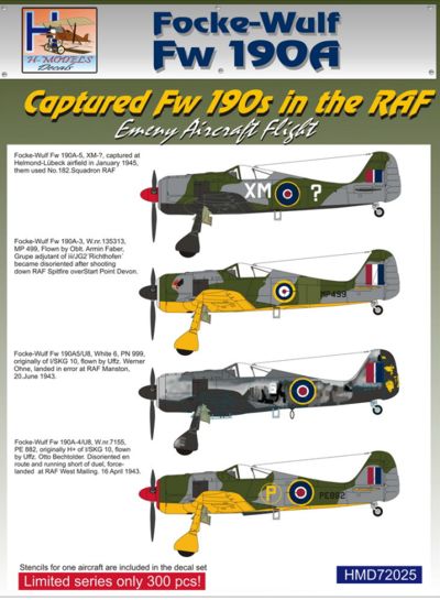 H-Model Decals - HMD72025 - 1:72 | Captured Focke-Wulf Fw-190A-3/Fw-190A-4/Fw-190A-5 in RAF service More | Aircraft decals (military) | Catalogue | £6.30 | ||