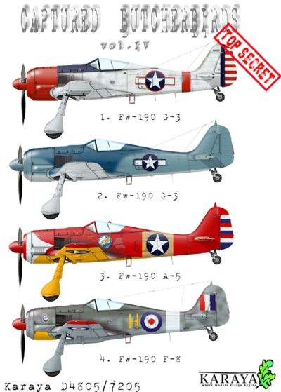 Karaya - KYD7205 - 1:72 | Captured Butcher Birds. 1. Focke-Wulf Fw-190G-3 W.Nr. 160057, captured by 85th FS/79th FG, Gerbini AB, Sicily, September 1943. Higher command of 79th FG. Examined at Anacostia NAS. 2. Focke-Wulf Fw-190G-3 W.Nr. 160057, as above. Early 1945 with the new U.S. Navy uniform. 3. Focke-Wulf Fw-190A-5, found in Tunisia by 79th FG. Painting scheme of Training School at Constantine, July 1943. Plane with anti dust filters. 4. Focke-Wulf Fw-190F-8, Yellow H, captured by South African soldiers in Italy (non-flyable condition). More | Aircraft decals (military) | Catalogue | £5.99 | ||