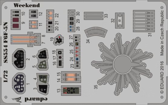 Grumman F6F-5N Hellcat Weekend (designed to be used with Eduard kits) Includes about 20 of the more important and prominent parts for detailing the aircraft. Most sets are also available as part of a double set for the modeller who wants even more detail. Please see the picture for the double set part number.