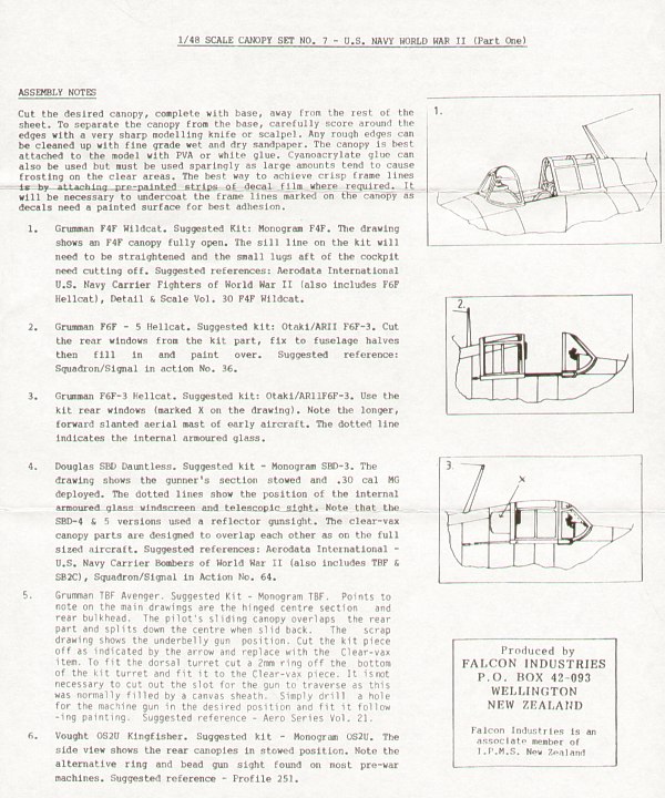 USN Post WWII part 1. Grumman F4F Wildcat (designed to be used with Monogram kits) Grumman F6F-5 Hellcat (designed to be used with Airfix, Arii and Revell kits) Grumman F6F-3 Hellcat (designed to be used with Airfix, Arii and Revell kits) Douglas SBD Dauntless (designed to be used with Monogram kits) Grumman TBF Avenger (designed to be used with Monogram kits) Vought OS2U Kingfisher (designed to be used with Monogram kits) Curtiss SB2C Helldiver (designed to be used with Monogram kits)