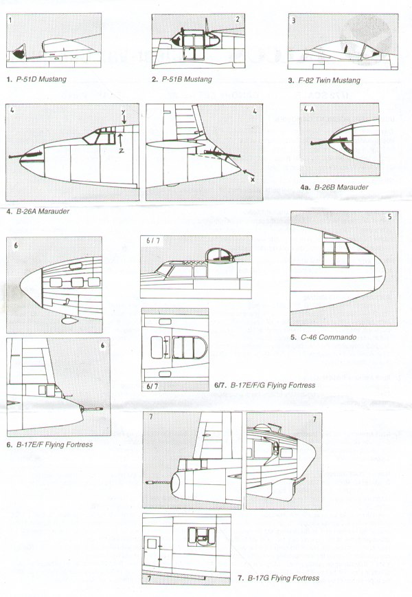 USAAF WWII (Part3). North-American P-51D Mustang (designed to be used with Hasegawa kits) (newest tooling) North-American P-51B Mustang (designed to be used with Hasegawa kits) North-American F-82 Twin Mustang (designed to be used with Monogram kits) Martin B-26A/B Marauder (designed to be used with Monogram kits) Curtiss C-46 Commando WI Boeing B-17E/B-17F Flying Fortress (designed to be used with Academy kits) Boeing B-17G Flying Fortress (designed to be used with Academy kits)