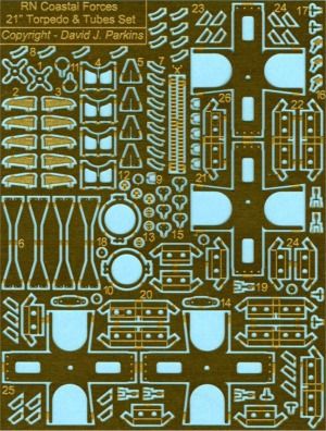 21' Torpedo and Tubes Set - two resin tubes - each with separate cast front ends that can be fitted to portray either loaded or empty tubes. The tubes are supplied with many fine details and with the support framework that fits to the girder framework that is individual to the vessel you are fitting the tubes to. In addition, a