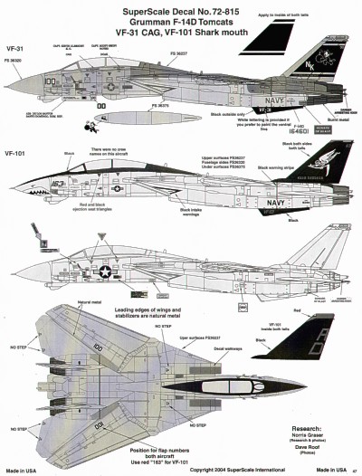 Microscale - SS72815 - 1:72 | Grumman F-14D Tomcat (2) 164601 NK/100 VF-31 CAG USS Abraham Lincoln low vis, black tail; 163414 AD/163 VF-101 Grim Reapers, Red lettering, low vis, black tail, shark mouth More | Aircraft decals (military) | Catalogue | £7.99 | ||