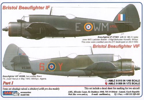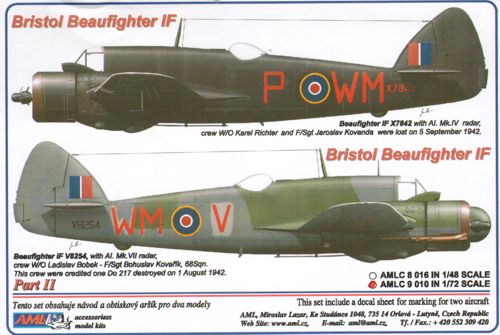 AML - AMLC9010 - 1:72 | Bristol Beaufighter Mk.IF X7842 (WM-P), with AI. Mk.IV radar, crew W/O Karel Richter and F/Sgt Jaroslav Kovanda were lost on 5 September 1942. Beaufighter Mk.VIF V8254 (WM-V), crew W/O Ladislav Bobek - F/Sgt Bohuslav Kova...a"˘'k, 68Sqn. This crew were credited one Do 217 destroyed on 1 August 1942 (designed to be used with FROG, Hasegawa and Hobby 2000 kits) More | Aircraft decals (military) | Limited Availability | £4.40 | ||