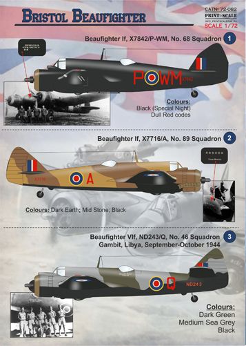 Print Scale - PSL72082 - 1:72 | Bristol Beaufighter 1. Beaufighter Mk.IF, X7842/P-WM, No. 68 Squadron 2. Beaufighter Mk.IF, X7716/A, No. 89 Squadron 3. Beaufighter Mk.VIF, ND243/Q, No. 46 Squadron Gambit, Libya, September-October 1944 4. Beaufighter Mk.VIF, V8762/A-6, No. 600 Squadron 5. Beaufighter Mk.VIF, V8447/S, No. 89 Squadron 6. Beaufighter Mk.IC, T3317/XK-?, No. 272 Squadron 7. Beaufighter Mk.IC, A19-40/EH-G, No. 31 Squadron, RAAF 8. Beaufighter Mc.IIF, T3145/KP-K, No. 409 Squadron, RCAF 9. Beaufighter Mk.21 A8-27 DU-A 'Reckabye Baby', flown by the crew of F/L McMilan & F/O Hayes of no. 22 Sqn RAAF, based at Morotai in February 1944 More | Aircraft decals (military) | Catalogue | £15.99 | ||