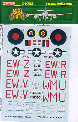 Techmod - TM72005 - 1:72 | Bristol Beaufighter Mk.VIF (5) EL154 EW-Z; X8005 EW-R both Dark green/mid sea grey camouflage; EL146 EW-V overall black; V8656 WM-U 66 Sqn; KW147 USAAC 1943 More | Aircraft decals (military) | Catalogue | £4.50 | ||