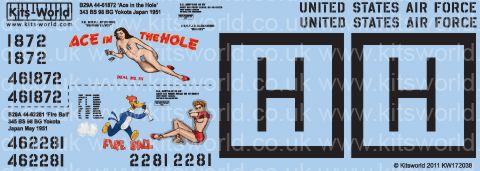 Kits-World - KW172038 - 1:72 | Boeing B-29A Superfortress (2) 44-61872 343rd BS /98th BG 'Ace in the Hole'; 44-62281 345th BS /98th BG 'Fire Ball', Both H in black square on fin, Yokota Japan May 1951 Individual aircraft markings only. More | Aircraft decals (military) | Catalogue | £10.20 | ||