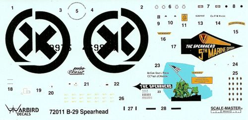Warbird Decals - WB72011 - 1:72 | Boeing B-29 Superfortress 269975 1st BS/ 9th BG/ 313th BW Tinian AFB. Nose art The Spearhead 5th Marine Divison badge on starboard side and and Iwo Jima Flag raising picture on port side, black/yellow bans on rear fuselage and Circle X on fin More | Aircraft decals (military) | Limited Availability | £11.99 | ||