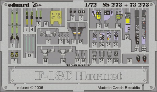 Eduard - EDSS273 - 1:72 | McDonnell-Douglas F/A-18C Hornet PRE-PAINTED IN COLOUR! (designed to be used with Hasegawa kits) Includes about 20 of the more important and prominent parts for detailing the aircraft. Most sets are also available as part of a double set for the modeller who wants even more detail. Please see the picture for the double set part number. More | Aircraft detailing sets (etched) | Catalogue | £4.50 | ||