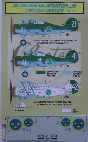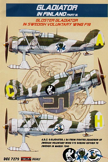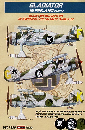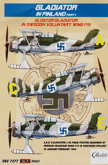 AML - AMLD72001 - 1:72 | Re-printed! Gloster Gladiator Mk.I/Mk.II (7) GL-273 1/LeLv 16 Haarajarvi, August 1941; GL-264 1/LeLv 16, Hirvas, June 1942; GL-270 1/LeLv 16 Solomanni, August 1942; GL-265 1/LeLv 16 Vista, June 1942, with skis. GL-275 1/LeLv 16. Viiksjarvi. Feb1943; All Finnish A.F; F19 'Skull & Crossbones' Swedish A.F. March 1940; Yellow F 248, F19 Swedish volunteer Regiment, 1940 More | Aircraft decals (military) | Catalogue | £5.80 | ||