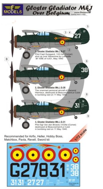 LF Models - LFMC72218 - 1:72 | Gloster Gladiator Mk.I over Belgium (3 decal options) (designed to be used with Airfix, Heller, Hobby Boss, Matchbox, Pavla, Revell and Sword kits) More | Aircraft decals (military) | Catalogue | £7.60 | ||