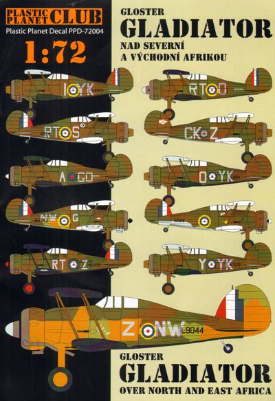 Plastic Planet Club - PPD-72004 - 1:72 | Gloster Gladiator over North Africa. Gladiator Mk.I 80. Sqn. RAF Pilot Flt.Off. P. Wykeham-Barnes Sidi Barrani, Egypt, 1940 Gladiator Mk.I 112. Sqn. RAF Pilot Flt. Lt. J. E. Scoular Port Sudan, 1940 Gladiator Mk.II 94. Sqn. RAF Aden, 1940 Gladiator Mk.II 3. Sqn. RAAF Pilot Off. A. H. Boyd Gerawala, Egypt, 1940 Gladiator Mk.II 112. Sqn. RAF Yannina airfield, 1941 Gladiator Mk.II 80. Sqn. RAF Egypt, 1940 Gladiator Mk.II 3. Sqn. RAAF Pilot Off. Peter Turnbull Martuba, Libya, 1941 Gladiator Mk.I 112. Sqn. RAF Pilot Plt. Off. P. O. V. Green Gedaref, Sudan, 1940 Gladiator Mk.II 237. Sqn. RAF Pilot Flg. Off. P. Simmonds Asmara, Eritrea, 1941 Gladiator Mk.I 80. Sqn. RAF Pilot Flt. Lt. M. T. StJ. Pattle Amriya, Egypt, 1940 Gladiator Mk.I 80. Sqn. RAF Pilot Plg. Off. G. K. Baynham Amriya, Egypt, 1940 More | Aircraft decals (military) | Catalogue | £6.60 | ||