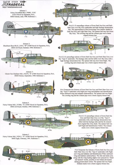 Xtradecal - X72134 - 1:72 | Fleet Air Arm (FAA) Selection 1939-41 (9) Fairey Swordfish Mk.I P4224 5R 819 NAS H.M.S. Illustrious 1940; K8867 G3P 812 NAS H.M.S. Glorious 1939; P4085 U3G 815 NAS H.M.S. Furious 1940; Supermarine Walrus Mk.I W2771 9F 710 NAS H.M.S. Albatross 1940; Fairey Seafox Mk.I K8591 718 NAS H.M.S. Ajax 'Battle of the River Plate' 1939; Blackburn Skua Mk.II L3015/F 800 NAS H.M.S. Ark Royal 1940; Gloster Sea Gladiator Mk.I N2276/H 804 NAS H.M.S. Furious 1940; Fairey Fulmar Mk.I N1868 7L 807 NAS H.M.S. Ark Royal 1940; N2015 7C 805 NAS H.M.S. Eagle 1941. More | Aircraft decals (military) | Catalogue | £8.99 | ||