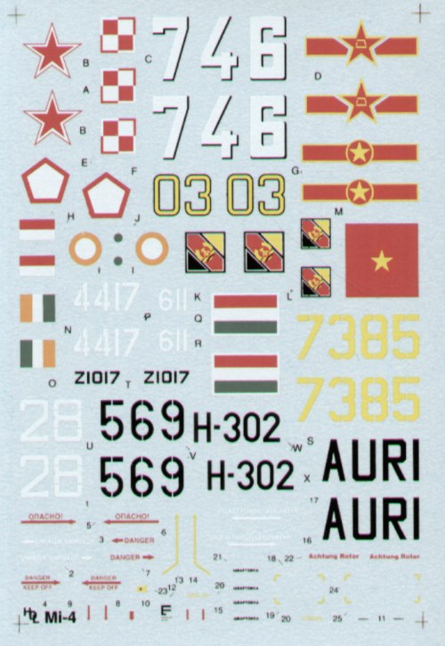 Mil Mi-4A Hound A (9) Yellow 03 Soviet Air Force 1965; White 611 Ploish Air Force 1975; White 746 E. Geramn Air Force 1968; Black 569 E. German Air Force; White 28 Hungarian Uprising 1956; Yellow 7385 Chinese Air Force 1974; White 4417 N. Vietnamese Air Force 1969; Z1017 Indian Air Force 1965; H-302 Indonesian Air Force 1963; Variety of schemes.