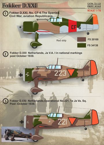 Print Scale - PSL72123 - 1:72 | Fokker D.XXI 1. Fokker D.XXI, No. CF-6. 2. Fokker D.XXI Netherlands, Ja V.A. I in national markings post October 1939. 3. Fokker D.XXI Netherlands,Operational No.221, 1e Ja Va. Sq. Post -October 1939. 4. Fokker D.XXI (4rd series), Unit: LeLv 30. Serial: FR-157, Winter 1942. Insignia of running Red Army man on the board. White spots painted over camouflage. In this appearance aircraft was shot down im 1942. 5. Fokker D.XXI (4-й серии), 2/LeLv 30,No: 5 (FR-142) Pilot - senior Sgt.A.Trikkonen. In 1942. Note: Death insignia and silhouette of I-16 on the tail. White background circles on the national markings are overpainted. 6. Fokker D.XXI in winter cmouflage. Winter 1939/40. This aircraft was flown by Capt. J Sarvanto of HLeLv24, top scoring pilot of the Winter War. 7. Fokker D.XXI manufactured in Finland with Bristol Mercury VIII engine. According to type marking FR-92 it was the tenth serial plane. In July 1941, during so called 'Continuos War', it was in the order of 2/TLeLv 12. 8. Fokker D.XXI Pilot - Commander of the LeLv 30, Maj. Ludvig Bremer, Porri airfield, May 1942. He had an Ace of Hearts painted on the rudder of his FR-157 between Summer 1941 and Spring 1942. Maj.Bremer chose the Hearts according to his wife Hertta. 9. Fokker D.XXI (4th series) Unit: 2/LeLv 30, No. 1 (FR-129) pilot - Capt.Veikko Karu. Suulajarvi airfield, Autumn 1941. 10. Fokker D.XXI (4th series), Unit: 3/LeLv 30, No. 3 (FR-148) Pilot - Luutnanti Martii Kalima, Tiiksjarvi airfield (now Soviet Territory), Spring 1942. 11. Fokker D.XXI part: 2. the JaVA Room: 213 (c/n. 5486) Second serial aircraft LVA (Luchtvaartafdeling) powered by a Bristol Mercury VII engine. Bear identification marks used until October 1939, the Squadron was based in Shifole, 11-14 May 1940, operated from the airfield at Bujksloot. The pilot, Lieutenant Fokuin de Greve knocked on this machine 2 German Bf-109E May 10, 1940, later on it whether it was shot down by itself . 12. Fokker D.XXI FR-97 of 4/LLv 24 (4.lentue/Len-tolaivue 24) flown by Lt.J.Sarvanto and operating from Immola, Winter 1939-1940. Note temporary winter finish on upper surfaces. This aircraft was transferred to LLv 32 in April 1940, and, during the 'Continuation War', flew from Hyvinkaa and Utti. Shot down on 25 July 1941. 13. Fokker D.XXI (4 series) part: LeLv 14 number: 11 (FR-140), 1940 At Kiel signs two WINS. Gift inscription on the machine where the Fokker to the winter war. 14. Fokker D.XXI (3 series) part: LeLv 32 number: X (FR-109) pilot-Captain e. Hejnilla. 1941. 15. Fokker D.XXI, a former Dutch Fokkers, captured in May 1940, and used for a short time in the Luftwaffe. 16. IIIJ (Fokker D.XXI), Unit: 2. Eskadrille, No. J-47A Fokker D.XXI constructed by the Danish military at Klovermarken. It served with the 2nd Squadron in April 1940 and was destroyed on the ground by Bf.110's of ZG 1. More | Aircraft decals (military) | Catalogue | £15.99 | ||