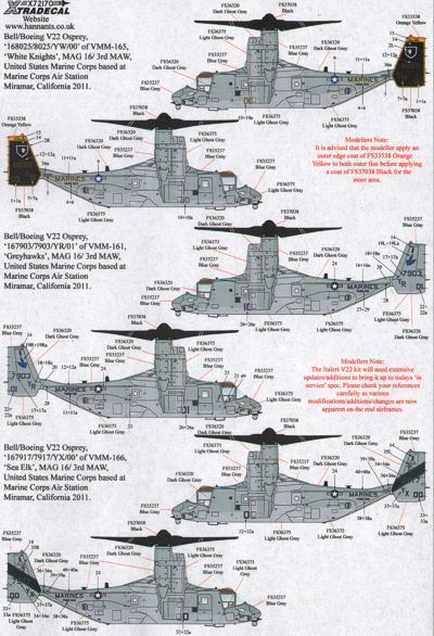 Bell-Boeing MV-22B Osprey (7)168025 YW/00 VMM-165 White Knights with black fins; 167903 YR/01 VMM-161 Greyhawks with coloured markings; 167917 YX/00 VMM-166 Sea Elk with coloured markings. With full low viz data etc. All MCAS Miramar 2011. 167914 YP/06 VMM-163 Ridge Runners lo-viz; 168006 YZ/00 VMMM-363 Lucky Red Lions; 168011 YP-00 VMM-163 Ridge Runners coloured markings; 168022 PH/o5 VMM-561 Pale Horse lo-viz.