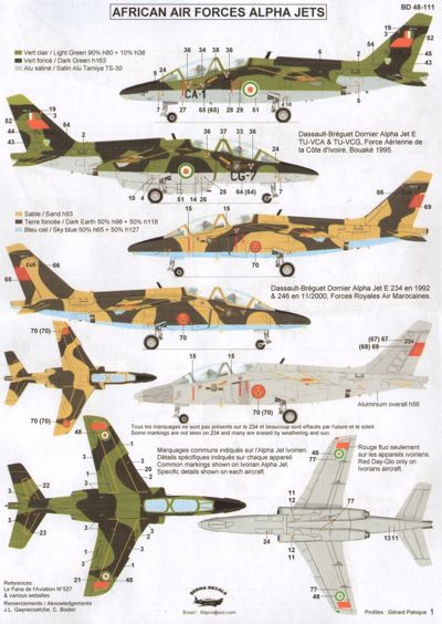 Berna Decals - BER48111 - 1:48 | African Air Forces Dassault-Dornier Alpha Jets : NAF 473 Nigeria 1990, 5V-MBB & 5V-MBD Togo 1981, QA 53 Qatar 1994 & 2010, 234 & 246 Morocco 1992 & 2000, 3502 Egypt 1982, TJ-XBX & TJ-XCI Cameroon 2005, TU-VCA & TU-VCG Ivory Coast 1995 More | Aircraft decals (military) | Catalogue | £14.60 | ||