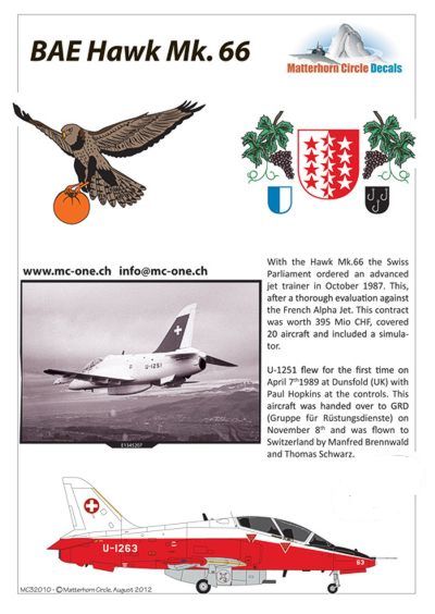 Matterhorn Circle - MHN48010 - 1:48 | BAE Hawk Mk.66. With the Hawk Mk66 the Swiss Parliament ordered an advanced jet trainer in October 1987. This after a thorough evaluation against the French Dassault-Dornier Alpha Jet. The contract worth 395 Mio CHF covered 20 aircraft and included a simulator. U-1251 flew for the first time on April 7th1989 at Dunsfold (UK) with Paul Hopkins at the controls. This aircraft was handed over to GRD (Gruppe f'r R'stungsdienste) on November 8th and was flown to Switzerland by Manfred Brennwald and Thomas Schwarz. The official introduction into the SAF inventory was celebrated January 31st 1990. This marked the end of the DH.115 de Havilland Vampire Trainer & DH.100 de Havilland Vampire as Training aircraft. Please note that the first Hawk Mk66 build in Great Britan was been painted in white with striking red trim on the wings, nose and tail. For better visibility, the scheme was changed and painted red on the belly up half the way of the fuselage. The upper side remained white. Unfortunately, not many pictures of the short lived livery exist. This scheme re-appears on the T-45 Goshawk that was developed for the U.S. Navy. What maintenance markings and walk ways concerns, very view were applied 'restricted to the ejection seat warnings and recue items as well as fire extinguishing. The remaining 19 Hawks (U-1252 'U-1270) were assembled in Emmen 'the final aircraft delivered to the air force on October 2nd 1991. As it is a tradition, the last aircraft leaving the line was adored with some special artwork 'reflecting a Hawk that carries away a 'Walliser Tomato'' some people argue, that it must be an Apricot. Also Flags of the Canton Wallis and City of Emmen are painted onto the fuselage surrounded by grapes. Already in 2002 the remaining 19 Hawks were put into storage. One aircraft (U-1256) was lost October 15th 1990 in a training accident in the Alps 'Nesthorn (VS). Of these, 18 Hawks were purchased by Finland in 2008. U-1251 remained in the Flieger & Flap Museum in D'bendorf. The short service period in Switzerland is simply explained 'technology advanced faster than expected 'with the introduction of the F-18, the Hawk could not fulfill the requirement of a digital cockpit and despite the low flying hours and excellent condition it was deemed as financially sound to withdraw the aircraft from service. Today, the Pilatus PC-21 fills the slot allowing a straight transition onto the F-18. This decal sheet has been designed based on painting instructions from the maintenance manuals as well as a thorough visit to U-1251 stored at Duebendorf. Special thanks for assistance go again to the Flieger and Flap Museum Duebendorf and to Bruno Schneider who have been immensely helpful on this project and others in the past. The decals themselves have been screen printed by the UK based Fantasy Printshop and guaranty a top quality product and easy application to the model. The decals must be applied onto a glossy surface to avoid the unwanted silvering. Decal softeners like Mircro Sol & Set work very nice. Once dry, excess glue from the decals should be removed with a soft damp cloth. [Mk.1a] More | Aircraft decals (military) | Catalogue | £19.99 | ||