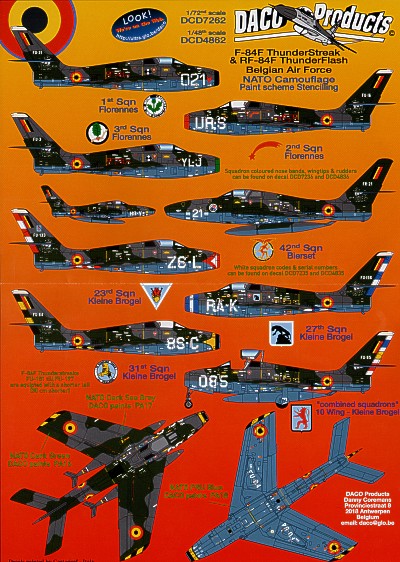 Daco Products - DCD4862 - 1:48 | Republic F-84F Thunderstreak and Republic RF-84F Thunderflash. Belgian Air Force NATO camouflage Data Stencilling. Includes National Insignia and Squadron Badges but no individual ID letters and numbers More | Aircraft decals (military) | Catalogue | £10.30 | ||