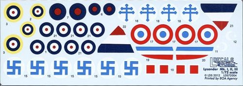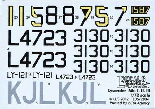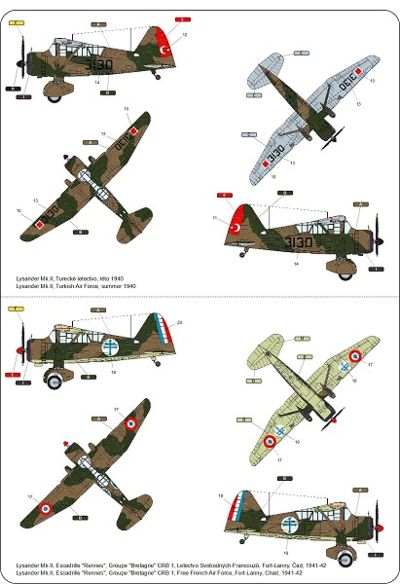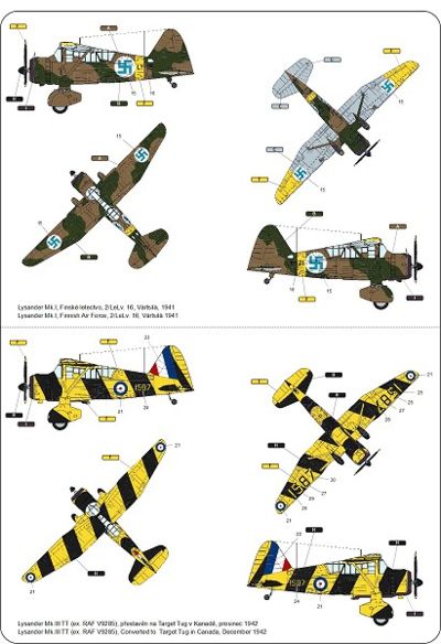 Westland Lysander Mk.I, Mk.II and Mk.III (6) RAF L4723 208(AC) Sqn Egypt 1938; KJ-L 18(AC) Sqn Old Sarum 1938; RCAF TT Mk.III I587 ex RAF V9285 1942; Turkish Air Force 3130 1940; Free French Air Force Chad 1941; Finland LY-121 2LeLv.16 1941