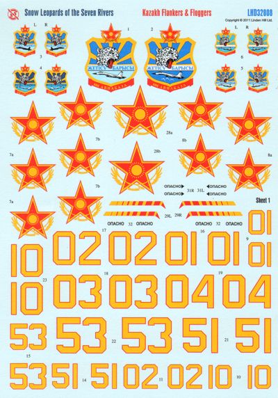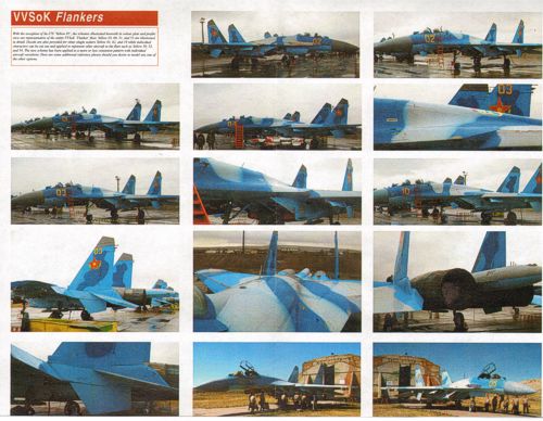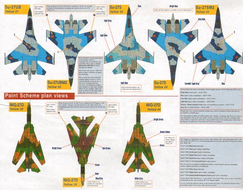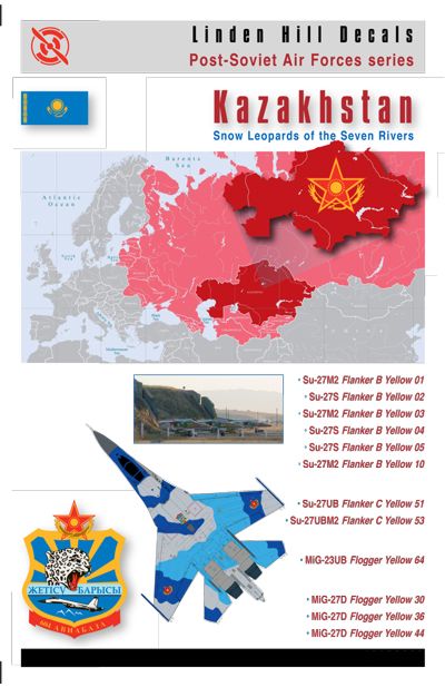 Sukhoi Su-27 Flankers and Mikoyan MiG-27D Floggers. Kazakhistan Snow Leopards of the Seven Rivers (12) Flanker B and C, Yellow 01, 02, 03, 04, 05, 10,51, 53; Flogger Yellow 64, 30, 36, 44. All numbers are yellow outlined red. Variety of camouflage schemes.