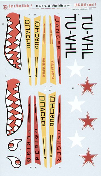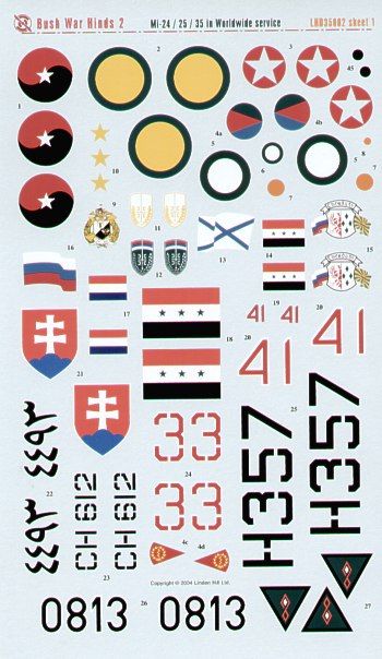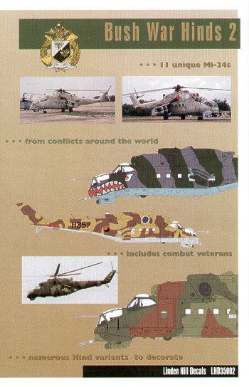 Bush War Hinds 2 - Mil Mi-24s' This package comes with a four colour loose-leaf reference booklet featuring profiles and photographs. Mil Mi-24RKh Red 41, Group of Soviet Forces in Germany, 1991 Mil Mi-24V 0813, Slovak Air Force Mil Mi-24V JSO `Red Berets', Serbia, 1998 Mil Mi-24VP Red 33, Naval Aviation of the Baltic Fleet of Russia Mil Mi-24D CH612, Sri Lankan Air Force, 1997 Mil Mi-35 H-357, ngolan Air Force, 1991 Mil Mi-35, Eritrean Air Force, 2000 Mil Mi-35, Ethiopian Air Force, 2000 Mil Mi-25 4493, Iraqi Army Aviation Corps, 1991 Mil Mi-24D TU-VHO, National Armed Forces of the Ivory Coast, 2002 Mil Mi-35, Z3039, Indian Air Force [Mil Mi-24V Hind-E Helicopter]